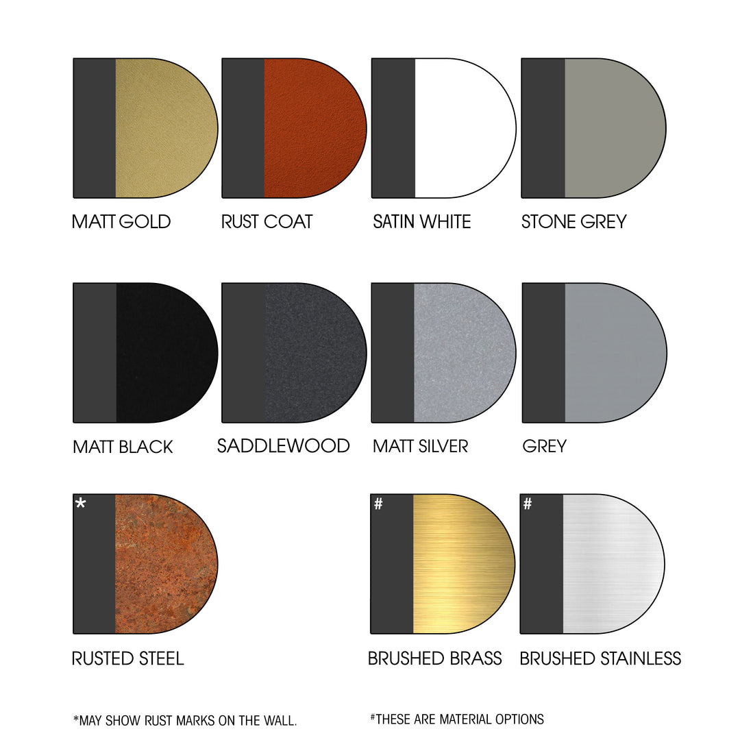 Available in 8 colors: Matt Gold, Rust Coat, Satin White, Stone Grey, Matt Black, Saddlewood, Matt Silver, Grey.